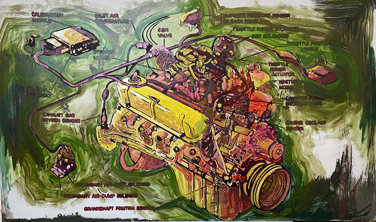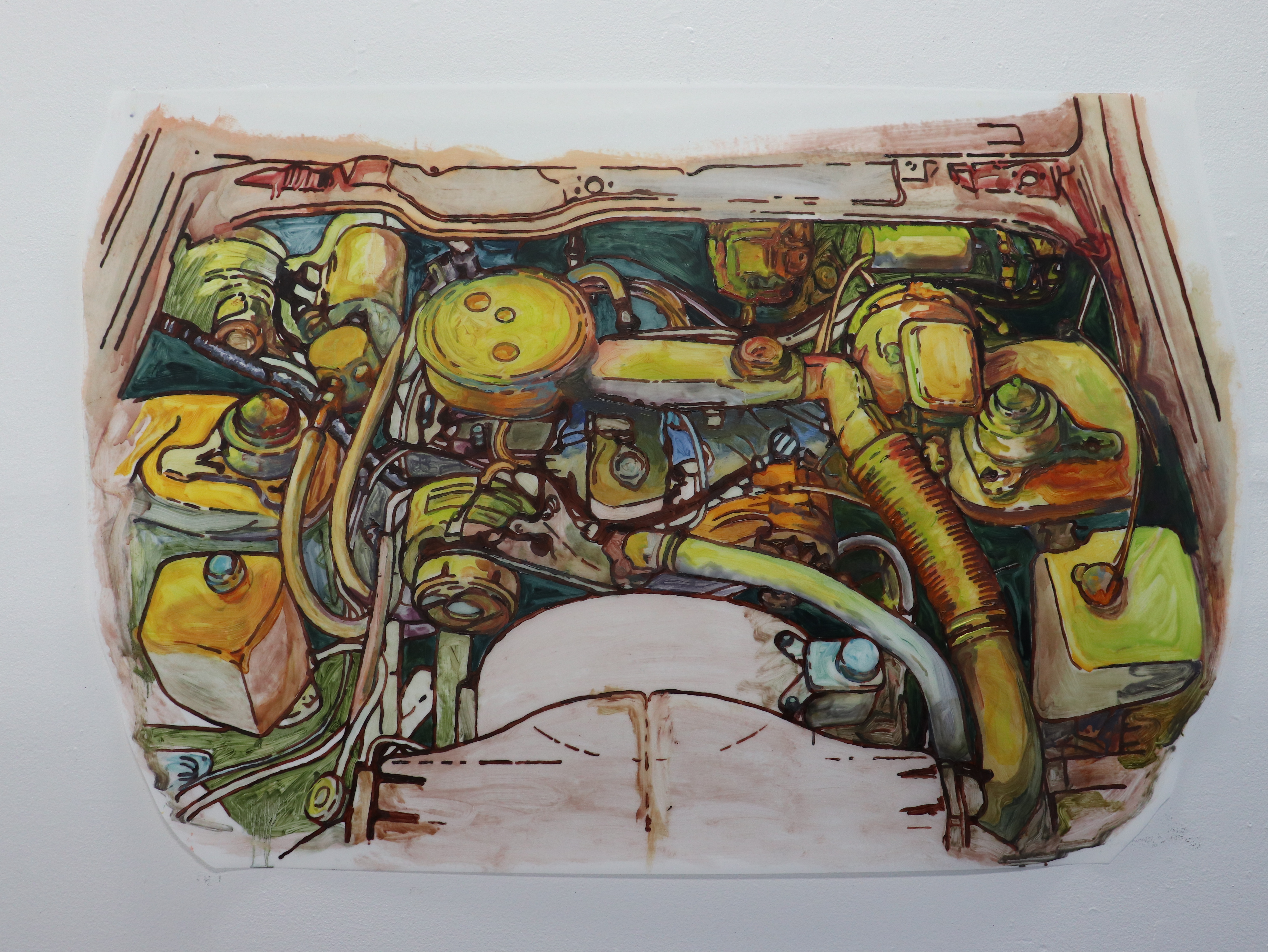 The diagrammatic aspect of my work represents these insides and their function in moving the vehicle. The didactic nature of the diagram challenges the romance of the paint. This tension reminds the viewer of the object's use value; it is more than just something upon which to project a fantasy. The paint animates and aestheticizes the sterile diagram, not to perpetuate the reverie of the object but to place it somewhere else. It celebrates the ingenuity of automobiles; the workers who make and fix them; and the culture to which they belong. The diagram’s reminder of the vehicle’s utility does not completely eradicate the nostalgia surrounding it; these values can happily coexist. Use value and display value both have their place in our appreciation of the classic American automobile.